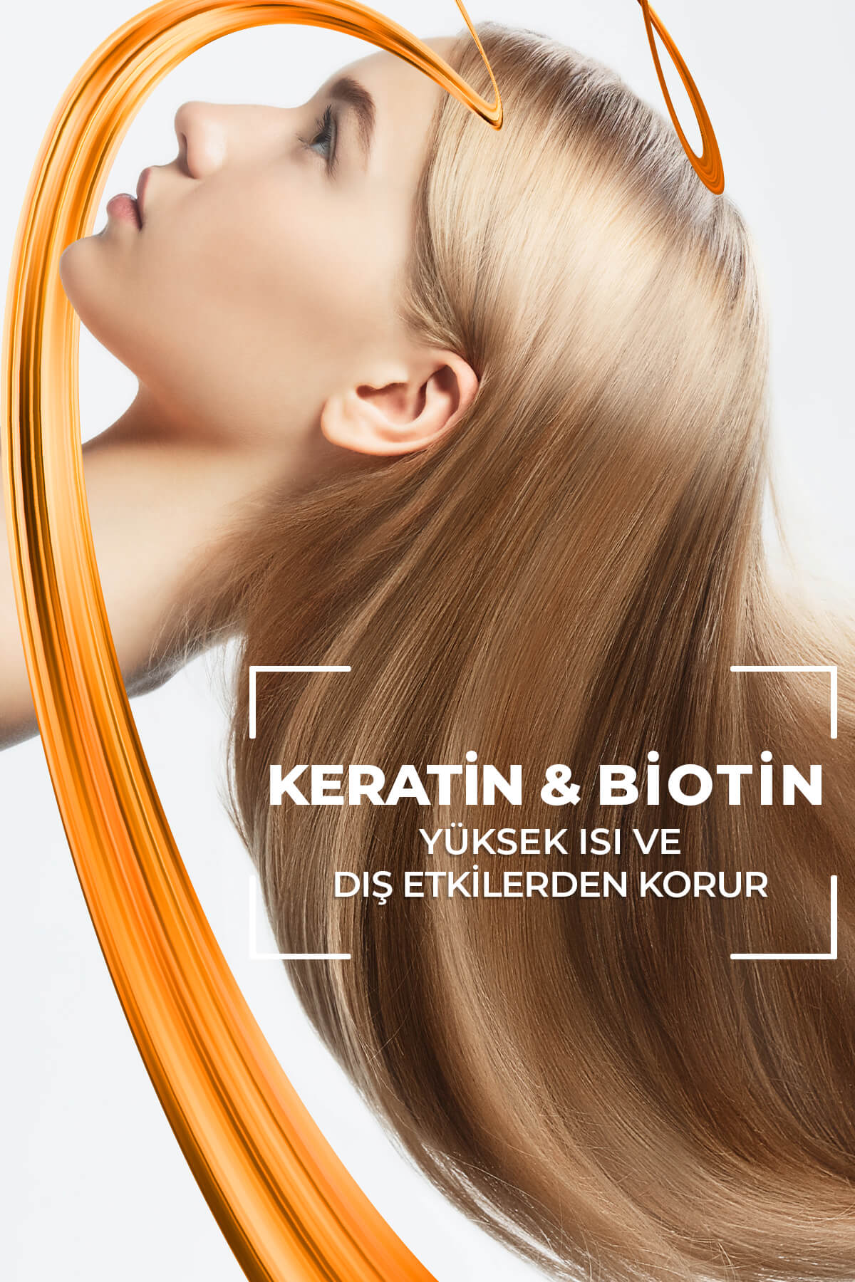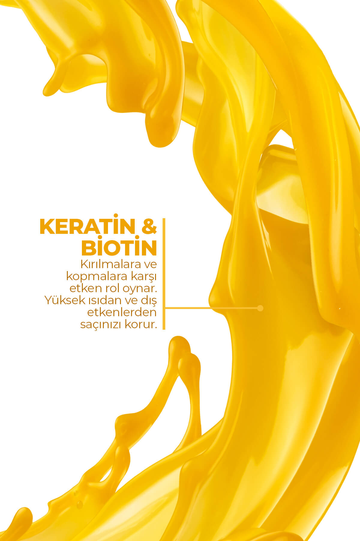 Saçlara keratin ve biotin yüklemesi yapar , kırılmalara ve kopmalara karşı etken rol oynar, yüksek ısıdan ve dış etkenlerden saçınızı korur.